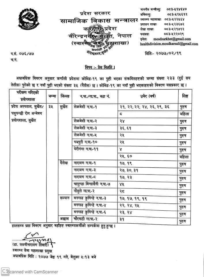 नयाँ पुष्टि भएकाहरूसँगै कर्णालीमा कोरोना संक्रमितको संख्या २३३ पुगेको छ । सोमबार बिहान मात्रै सुर्खेतमा ३२ जनामा कोरोना संक्रमण पुष्टि भएको थियो ।