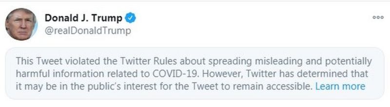 असोज २६, एजेन्सी । ट्वीटरले अमेरिकी राष्ट्रपति डोनल्ड ट्रम्पको अर्को एउटा ट्वीट लुकाएको छ जसमा उनले अब उनी कोरोनाभाइरबाट सुरक्षित भएको दाबी गरेका थिए । उनको पोस्टलाई ट्वीटरले भनेको छ, ‘यो पोस्ट कोभिड–१९ सम्बन्धि भ्रामक र सम्भवतः खतरनाक जानकारी दिन्छ त्यसैले यो ट्वीटरको नियमको उल्लंघन हो ।’ ‘तसर्थ, मानिसहरुले यसलाई नदेखुन्, यो नै जनहितमा हुनेछ,।’ यसअघि फक्स न्यूजलाई फोनमा दिएको एक अन्तरवार्तामा ट्रम्पले अब उनलाई कुनै पनि संक्रमण नभएको र उनको स्वास्थ्य दुरुस्त भएकोले काममा फिर्ता हुन सक्ने बताएका थिए ।