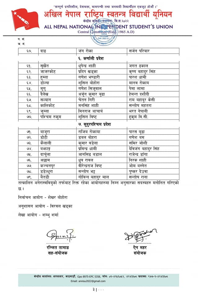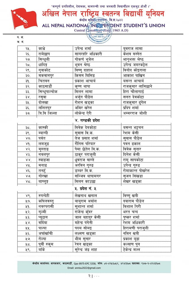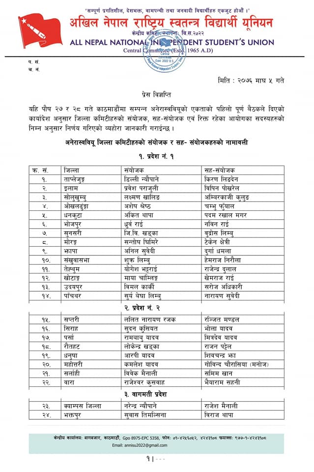 माघ ५, काठमाडौं । नेपाल कम्युनिष्ट पाटि (नेकपा)ले विद्यार्थी संगठन अनेरास्ववियूको जिल्ला संयोजक र सह संयोजकको जिम्मेवारी तोकेको छ । गत पुष १९ गते केन्द्रिय कमिटीले पुर्णता पाएसगैं आज जिल्ला संयोजक र सह संयोजकले पनि पुर्णता पाएको हो । अनेरास्ववियूले जिल्ला संयोजक र सह संयोजक सहित निर्वाचन, लेखा र अनुशासन आयोगको पनि जिम्मेवारी तोकेको छ ।