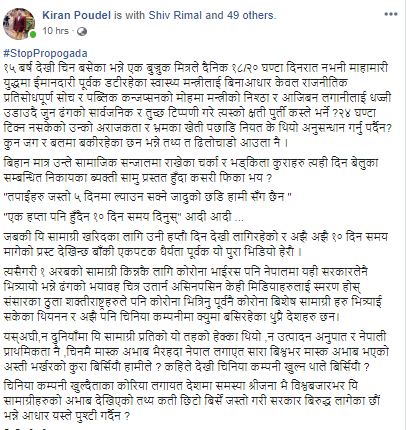 चैत्र १७, काठमाडौं । नेपाल कम्युनिष्ट पार्टी (नेकपा)को युवा संगठन राष्ट्रिय युवा संघका वरिष्ठ नेता किरण पौडेलले विश्वमा महामारिको रुपमा फैलिएको कोरोना भाईरस (कोभिड–१९)लाई प्रधानमन्त्री केपी शर्मा ओलीले नेतृत्वको सरकारले नै ल्याएको जस्तो गरी केही व्यक्ति तथा मिडियाहरु लागि परेको भन्दै कडा रुपमा आक्रोश व्यक्त गर्नुभएको छ ।