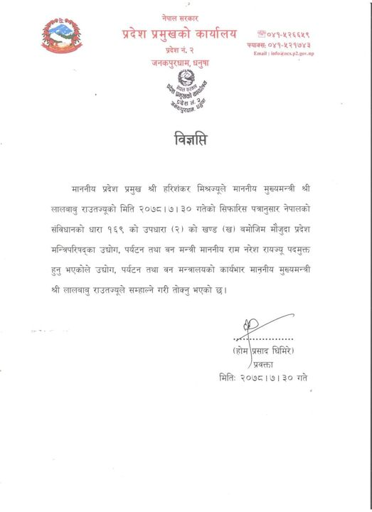 कात्तिक ३०, धनुषा । प्रदेश २ का उद्योग, पर्यटन तथा वनमन्त्री राम नरेश रायलाई बर्खास्त गरिएको छ । मुख्यमन्त्री लालबाबु राउतले रायलाई बर्खास्त गरेर वन मन्त्रालयको जिम्मेवारी आफैँले सम्हालेका छन् ।