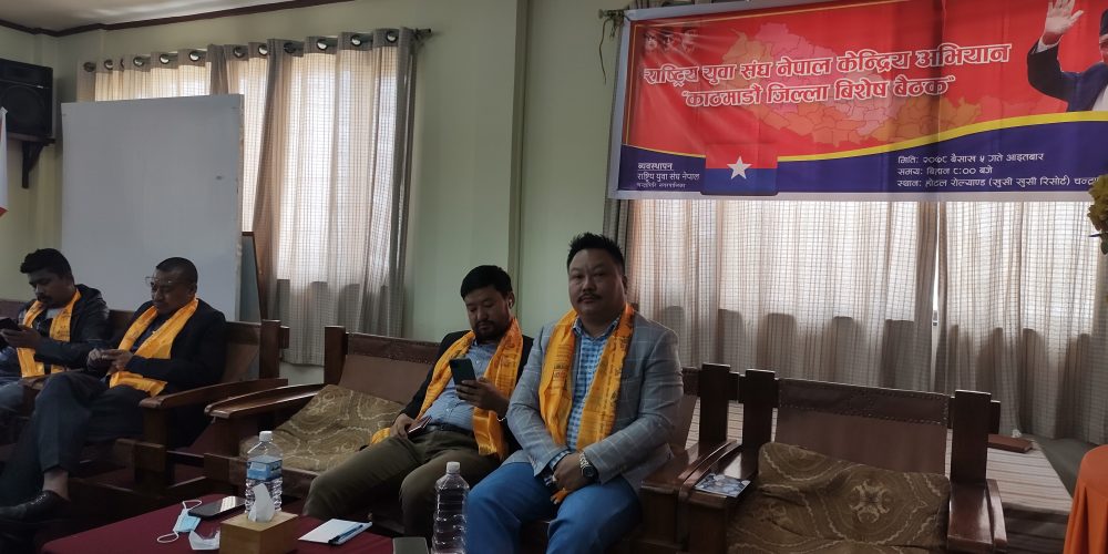 बैशाख ५, काठमाडौै । राष्ट्रिय युवा संघ काठमाडौं जिल्ला विशेष बैठक चन्द्रागिरि नगरपालिकामा रहेको खुसिखुसि रिसोर्टमा सम्पन्न भएको छ । नेपाल कम्युनिष्ट पाटी एमालेका केन्द्रीय कमिटी सदस्य तथा काठमाडौं जिल्ला अध्यक्ष कृष्ण राईको प्रमुख आतिथ्यतामा बैठक सम्पन्न भएको हो ।
