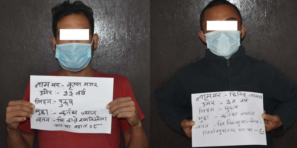 कात्तिक ७, सिन्धुपाल्चोक । मेलम्ची नगरपालिका–१० सिम्लेफाँटका नेत्रप्रसाद दाहालको हत्या गरी फरार रहेको आरोपमा दुई व्यक्ति पक्राउ परेका छन् । काभ्रे खानीखोला–८ का कृष्ण मगर र सिन्धुपाल्चोक लिसङ्खुपाखर–७ का छिरिङ तामाङ पक्राउ परेको जिल्ला प्रहरी कार्यालय, सिन्धुपाल्चोकका प्रहरी नायब उपरीक्षक दक्षकुमार बस्नेतले बताउनुभयो ।