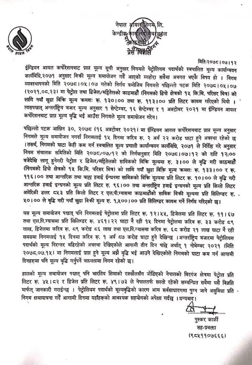 निगमले पेट्रोल, डिजल, मट्टितेलको लिटरमै तीन रुपैयाँ मूल्य बढाएको छ। यो मूल्यवद्धि पछि पेट्रोलको मूल्य लिटरको १ सय ३३ रुपैयाँ र डिजलको मूल्य १ सय १६ रुपैयाँ पर्नेछ। निगमले हवाई इन्धनको मूल्य लिटरमा १० रुपैयाँले बढाएको छ।
