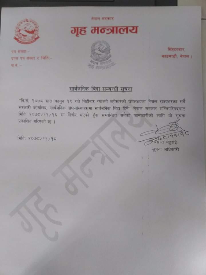 बुधबार गृह मन्त्रालयले विज्ञप्ति जारी गरी १६ फागुनको मन्त्रिपरिषद् बैठकको निर्णयअनुसार भोलि सार्वजनिक बिदा दिने निर्णय भएको जानकारी दिएको हो ।