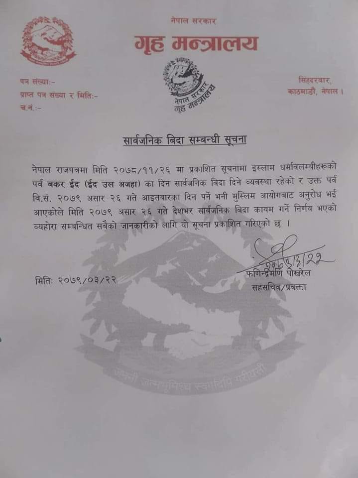 इस्लाम धर्मालम्बीहरुको पर्व बकर ईद (ईद उल बकाह)का अवसरमा बिदा दिने व्यवस्था अनुसार आगामी आइतबादर बकर ईद पर्ने भएकाले मुस्लिम आयोगको सिफारिसमा बिदा दिने घोषणा गरेको हो ।