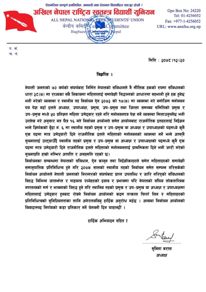तर, आयोगले स्थानीय तहको प्रमुख र उपप्रमुख वा अध्यक्ष र उपाध्यक्षको पदमध्ये कुनै एक पदमा मात्र उमेद्वारी दिने राजनीतिक दलले महिलाको मनोनयनलाई प्राथमिकता दिने भनी सूचना जारी गरेकोप्रति अनेरास्ववियुले गम्भीर आपत्ति र असहमति जनाएको हो ।