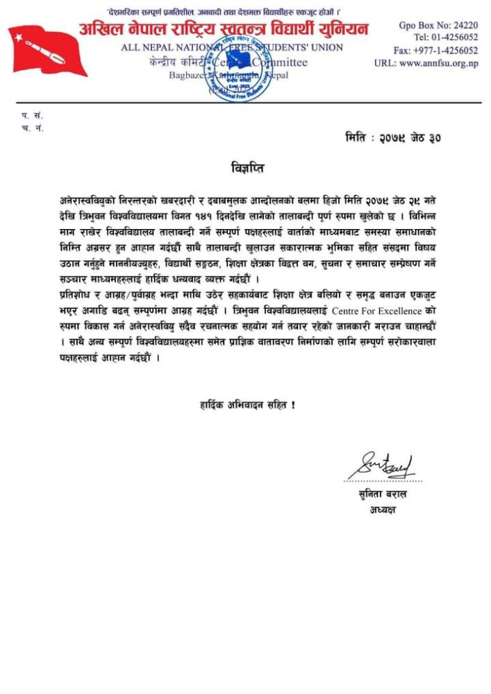 अनेरास्ववियुको अध्यक्ष सुनिता बरालद्वारा जारी विज्ञप्तीमा लेखिएको छ : अनेरास्ववियुको निरन्तरको खबरदारी र दबाबमुलक आन्दोलनको बलमा हिजो मिति २०७९ जेठ २९ गते देखि त्रिभुवन विश्वविद्यालयमा विगत १४१ दिनदेखि लागेको तालाबन्दी पूर्ण रुपमा खुलेको छ । विभिन्न माग राखेर विश्वविद्यालय तालाबन्दी गर्ने सम्पूर्ण पक्षहरुलाई वार्ताको माध्यमबाट समस्या समाधानको निम्ति अग्रसर हुन आहन गर्दर्छाै साथै तालाबन्दी खुलाउन सकारात्मक भुमिका सहित संसदमा विषय उठान गर्नुहुने माननीयज्युहरु, विद्यार्थी सङ्गठन, शिक्षा क्षेत्रका विद्वत्त वग, सुचना र समाचार सम्प्रेषण गर्ने सञ्चार माध्यमहरुलाई हार्दिक धन्यवाद व्यक्त गर्दछौं ।