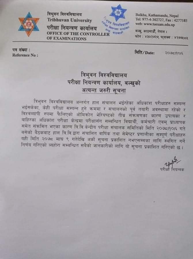 त्रिविको सूचनामा भनिएको छ, ‘हाल सञ्चालन भइरहेका अधिकांश परीक्षाहरु सम्पन्न भइसकेका, केही परीक्षा सम्पन्न हुने क्रममा र सञ्चालनको पूर्वतयारी अवस्थामा रहेको र विश्व्यापी रुपमा फैलिएको ओमक्रोम भेरियन्तको तीव्र संक्रमणका कारण उपत्यका र बाहिरका अधिकांश परीक्षा केन्द्रमा परीक्षासँग सम्बन्धित विद्यार्थी, कर्मचारी एवम् प्राध्यापकसमेत संक्रमित भएका कारण त्रिवि केन्द्रीय परीक्षा सञ्चालन समितिको बैठकबाट हाल सञ्चालित वार्षिक तथा सेमेस्टर प्रणालीका सम्पूर्ण परीक्षाहरु माघ ९ गतेदेखि अर्को सूचना प्रकाशित नभएसम्मका लागि स्थगित गर्ने निर्णय भएको छ ।’