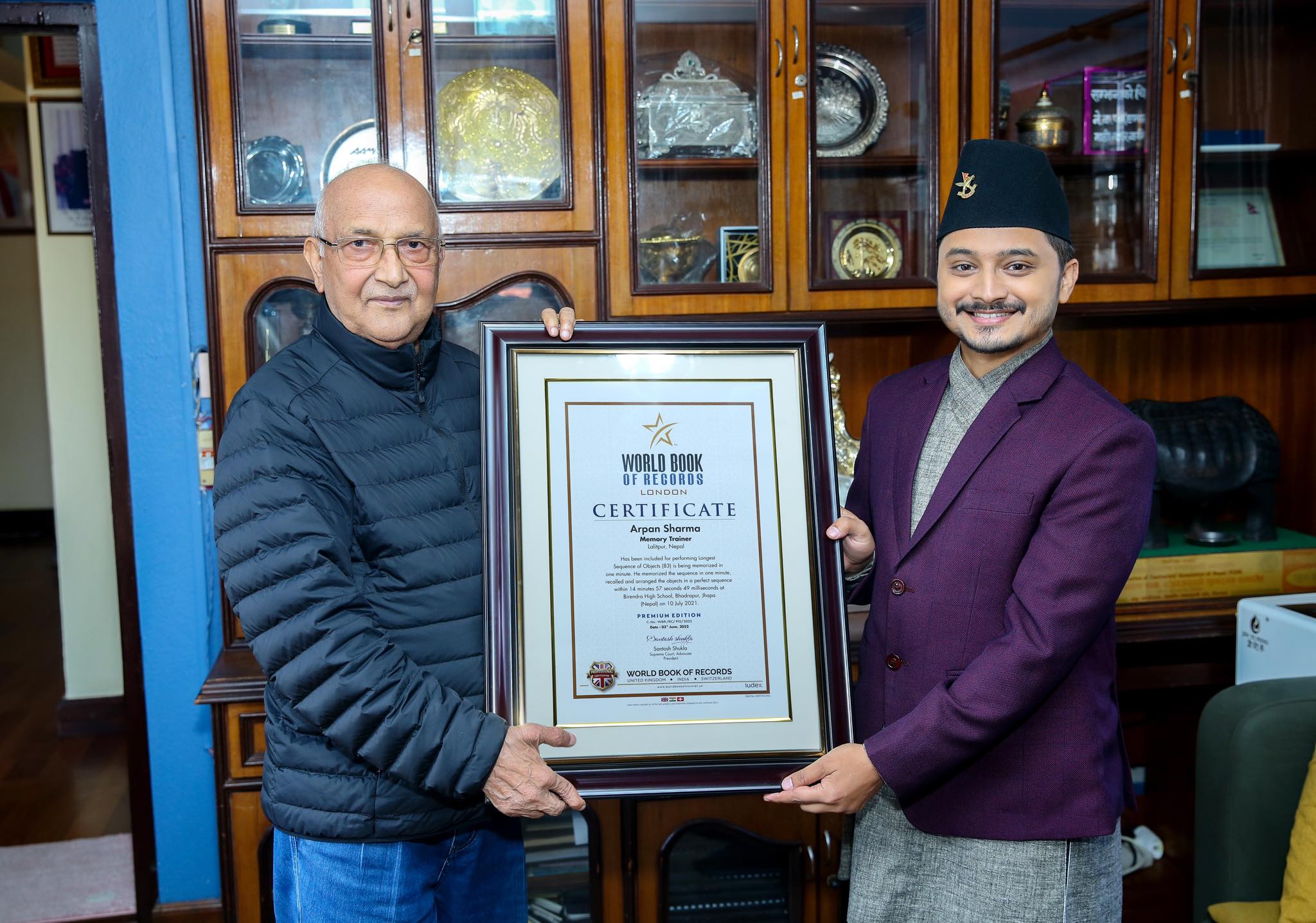पूर्व प्रधानमन्त्री एवं नेकपा एमालेका अध्यक्ष केपी शर्मा ओलीले उनलाई बधाई दिँदै नयाँ वर्ल्ड रेकर्डको प्रमाणपत्र हस्तान्तरण गरेका छन् । १ मिनटमा ८३ वस्तुहरुको क्रम स्मरण गरेर रचेको यो विश्व कीर्तिमानको श्रेय उनी आफ्नो ध्यान साधना र मेमोरी टेक्निकहरुलाई दिन्छन् ।