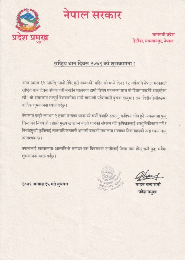 असार १५, हेटौंडा  ।  बागमती प्रदेशका प्रदेश प्रमुख यादवचन्द्र शर्माले राष्ट्रिय धान दिवसका अवसरमा शुभकामना व्यक्त गरेका छन् । १५ असारमा राष्ट्रिय धान दिवस मनाइने गरिन्छ ।
