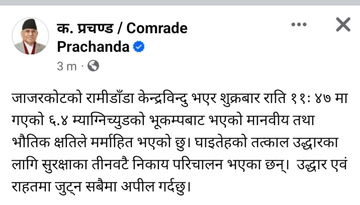 कात्तिक १८, काठमाडौँ । जाजरकोटमा गएको भूकम्पमा परी ठुलो क्षति भएपछि प्रधानमन्त्री पुष्पकमल दाहाल ‘प्रचण्ड’ ले उद्धार तथा राहतमा जुट्न सबैमा अपिल गरेका छन् ।