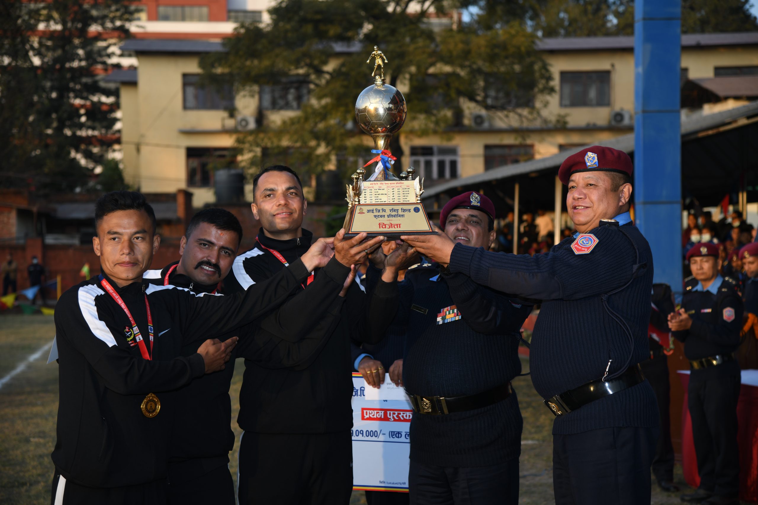 मंसिर २०, काठमाडौं । निमित्त प्रहरी महानिरीक्षक प्रहरी अतिरिक्त महानिरीक्षक टेक प्रसाद राईको प्रमुख आतिथ्यमा शुक्रबार आयोजित एक कार्यक्रमबीच राष्ट्रिय प्रहरी प्रशिक्षण प्रतिष्ठान महाराजगंजमा संचालित ४१औं आइजिपि रनिङ शिल्ड फुटबल प्रतियोगिता २०८० सम्पन्न भएको छ । कार्यक्रममा निमित्त प्रहरी महानिरीक्षक राईले प्रतियोगितामा बिजयी हुने गण्डकी प्रदेश प्रहरी कार्यालय पोखरा टिमका खेलाडी तथा अफिसियलहरूलाई पदक, प्रमाण-पत्र, रनिङ कप र नगद पुरस्कार प्रदान गर्नुभयो ।