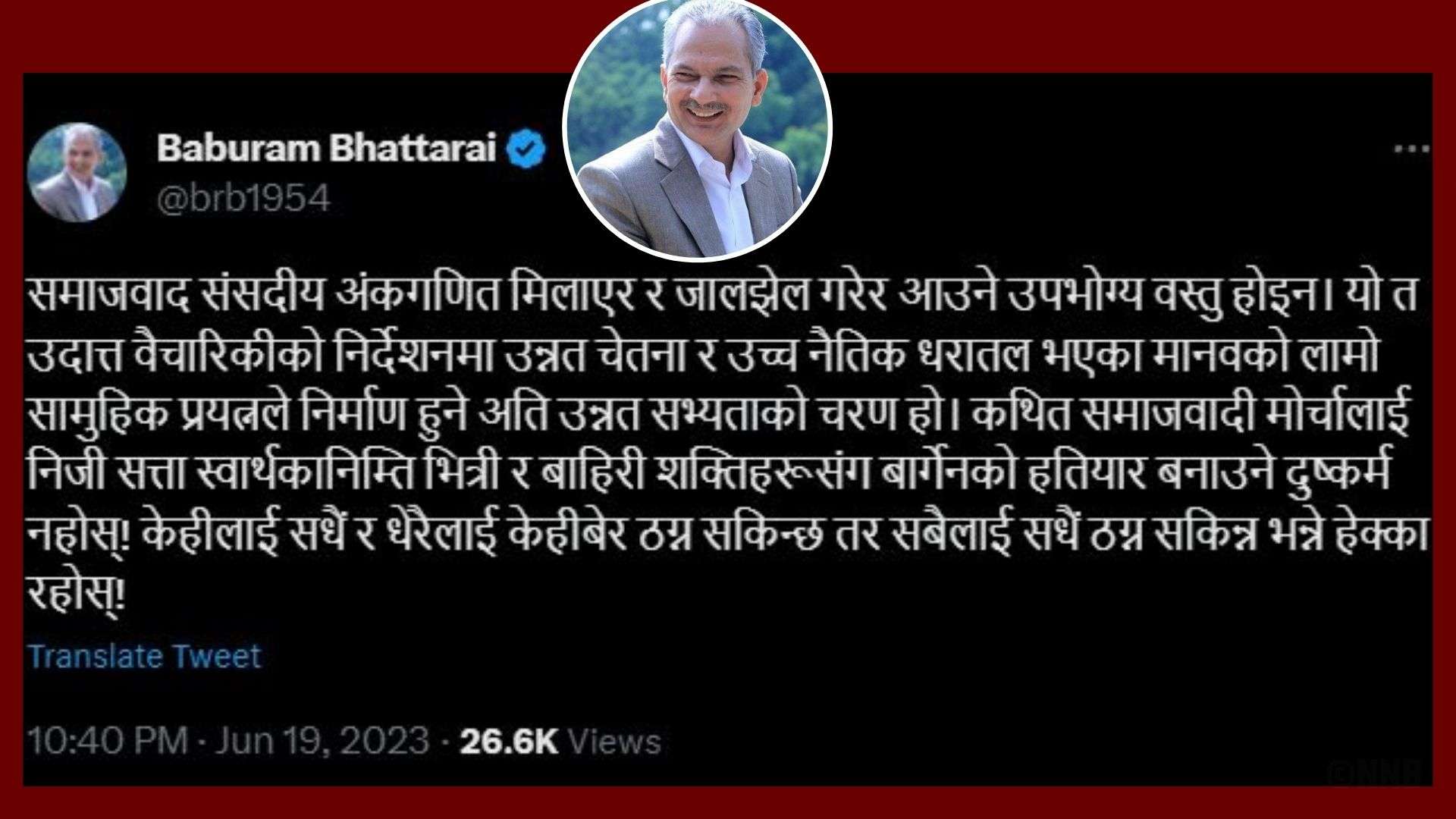 जालझेलले समाजवादको निर्माण नहुने भन्दै पुर्व प्रधानमन्त्री भट्टराईले मोर्चा संसदीय अंकगिणत मिलाएर वैचारिकीको निर्देशनमा उन्नत चेतना र उच्च नैतिकताले बन्ने बताए ।समाजवाद संसदीय अंकगणित मिलाएर र जालझेल गरेर आउने उपभोग्य वस्तु होइन । यो त उदात्त वैचारिकीको निर्देशनमा उन्नत चेतना र उच्च नैतिक धरातल भएका मानवको लामो सामुहिक प्रयत्नले निर्माण हुने अति उन्नत सभ्यताको चरण हो । उनको भनाई छ । नेकपा माओवादी केन्द्रका अध्यक्ष पुष्पकमल दाहाल प्रचण्डको नेतृत्वमा समाजवादी मोर्चा गठन भएपश्चात भट्टराईले यस्तो टिप्पणी गरेका हुन् ।