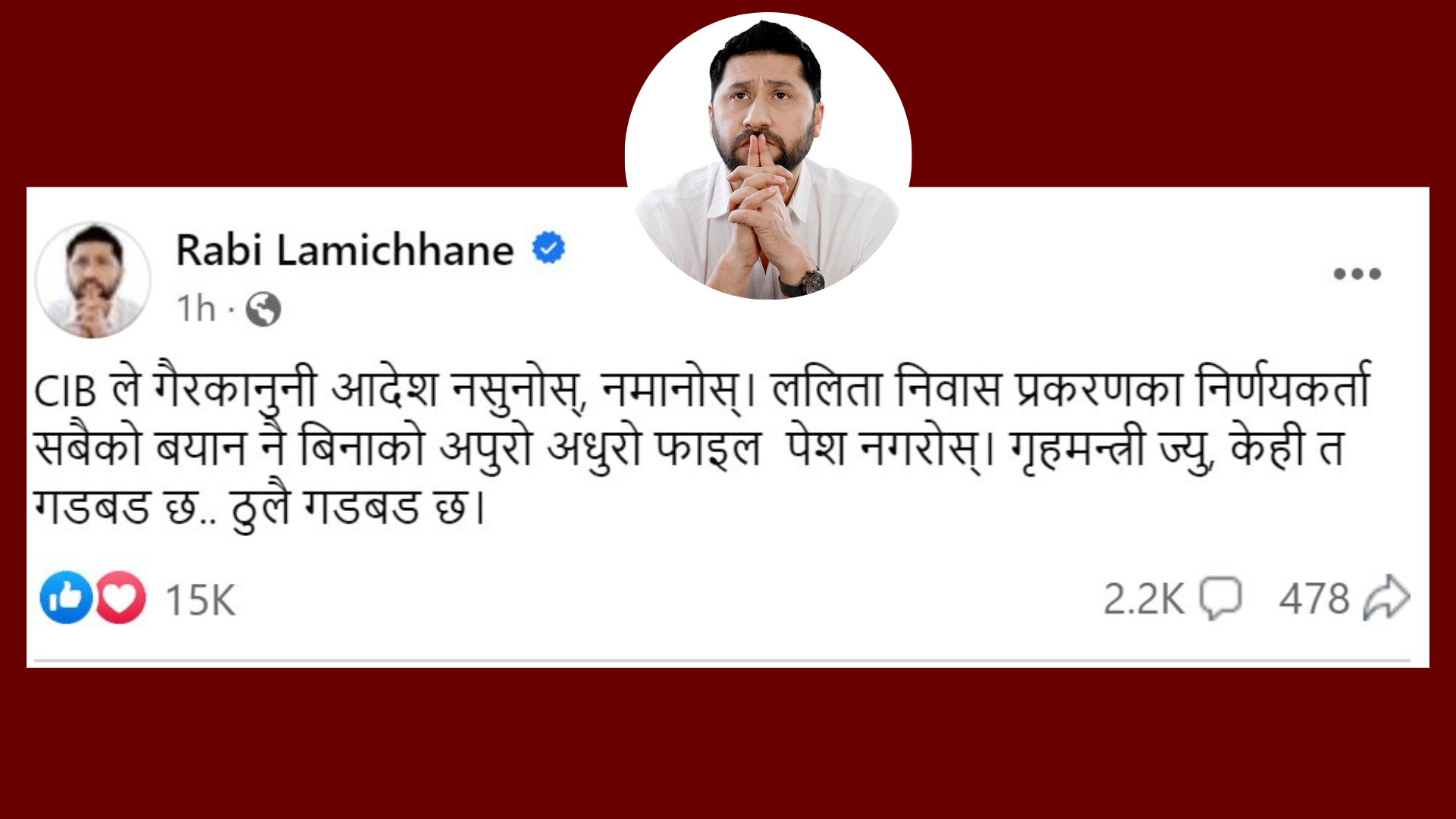 आईतबार सामाजिक सञ्जालमार्फत उनले सिआईबीलाई निर्णयकर्ता सबैको बयान नै बिनाको अपुरो अधुरो फाइल पेश गरी गैरकानुनी आदेश नमान्न आग्रह गरेका हुन् ।उनले लेखेका छन् ,‘ सिआइबीले गैरकानुनी आदेश नसुनोस्, नमानोस्। ललिता निवास प्रकरणका निर्णयकर्ता सबैको बयान नै बिनाको अपुरो अधुरो फाइल पेश नगरोस्। गृहमन्त्री ज्यु, केही त गडबड छ.. ठूलै गडबड छ ।’