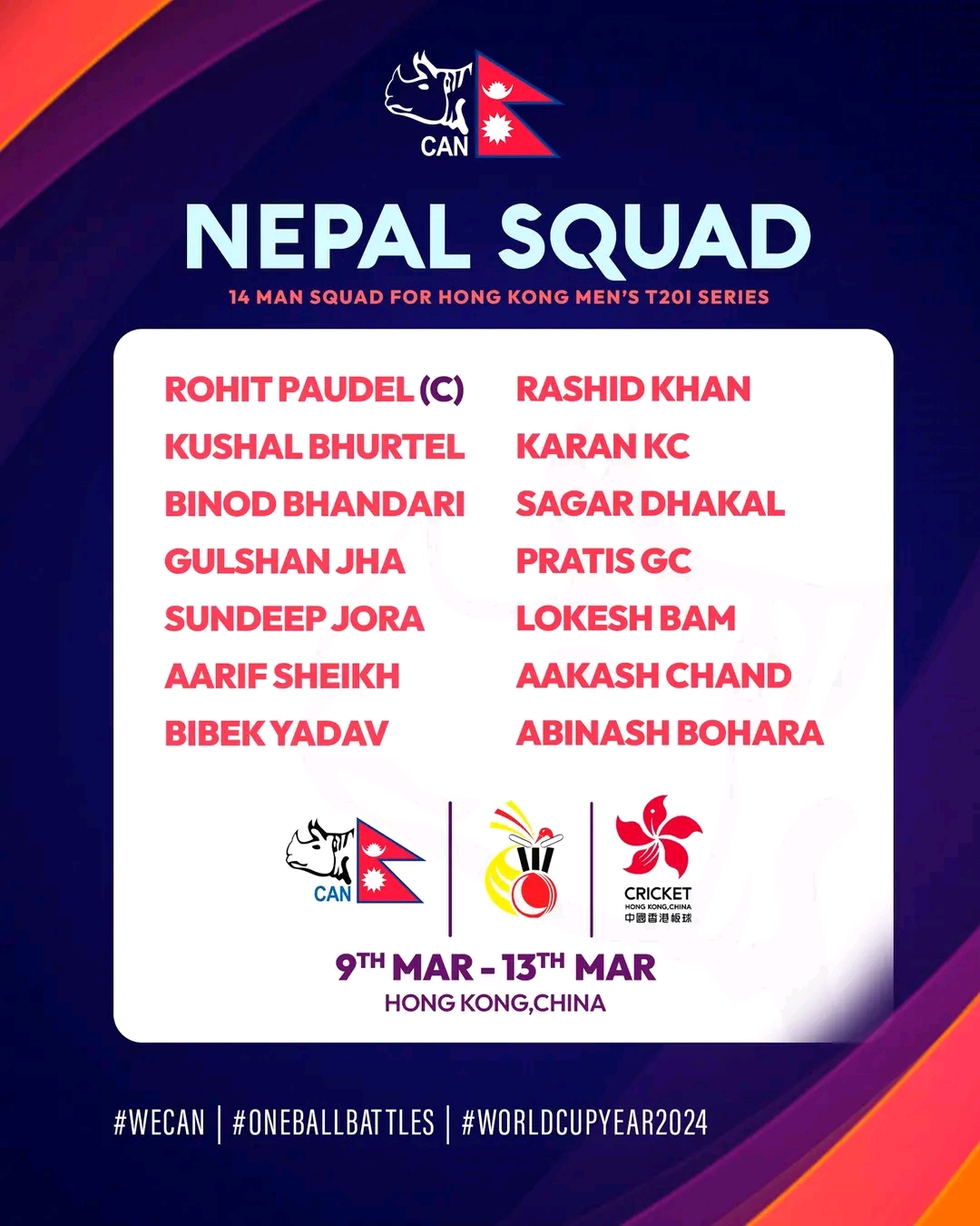 फागुन २०, काठमाडौं । नेपाल क्रिकेट संघ (क्यान) ले हङकङमा हुने टी-२० त्रिकोणात्मक सिरिज खेल्ने टिमको घोषणा गरेको छ । क्यानले रोहित पौडेलको कप्तानीमा १४ सदस्यीय टिमको घोषणा गरेको हो ।
