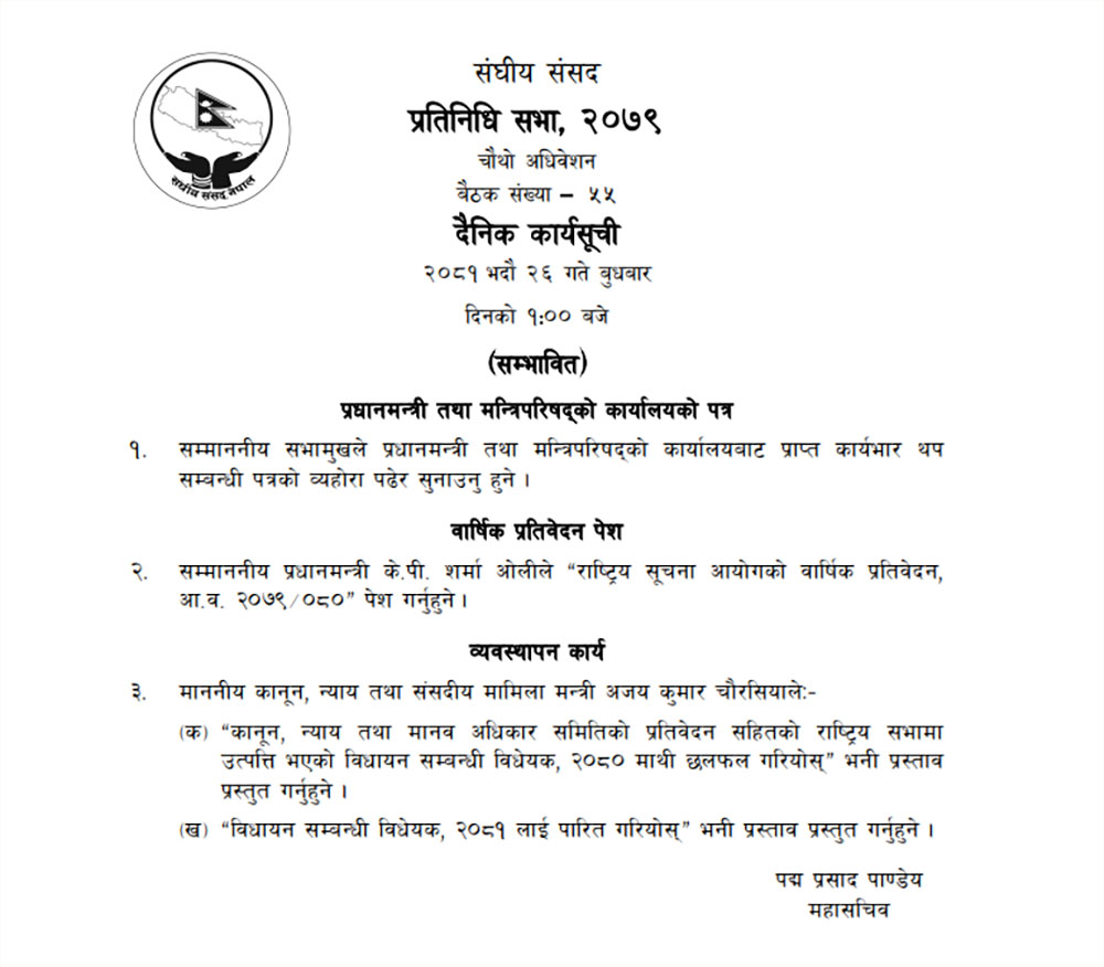 भदौ २६, काठमाडौँ । आज प्रतिनिधि सभाको बैठक बस्दै छ । संघीय सम्स्स्द सचिवालयका अनुसार आज अपराहन्न १ बजेदेखि प्रतिनिधि सभाको बैठक बस्दै छ ।