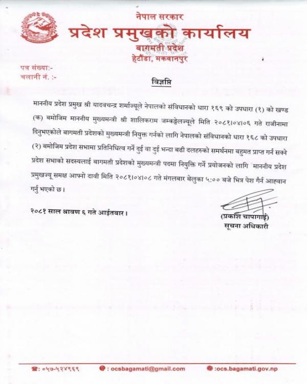 साउन ६, काठमाडौं । बागमती प्रदेशमा नयाँ सरकार गठनको आह्वान भएको छ । प्रदेश प्रमुख यादवचन्द्र शर्माले संविधानको धारा १६८ को उपधारा २ अनुसार मंगलबार साँझ ५ बजेसम्मको समय दिएर सरकारमा दाबी पेश गर्न आह्वान गरेका हुन् ।