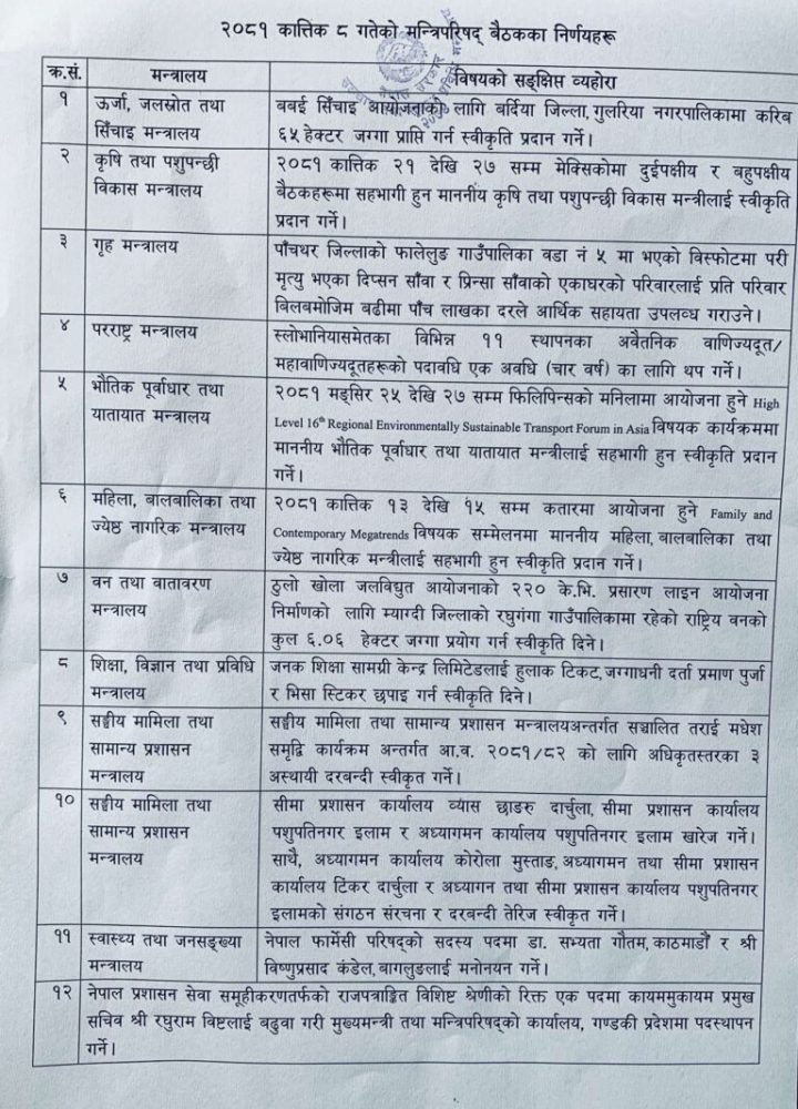 कात्तिक ९, काठमाडौँ । मन्त्रिपरिषद् बैठकले १२ निर्णय गरेको छ। सरकारका प्रवक्ता एवम् सञ्चार तथा सूचना प्रविधिमन्त्री पृथ्वीसुब्बा गुरुङले यही कात्तिक ८ गते बसेको मन्त्रिपरिषद् बैकले १२ वटा निर्णय गरेको जानकारी दिनुभयो।
