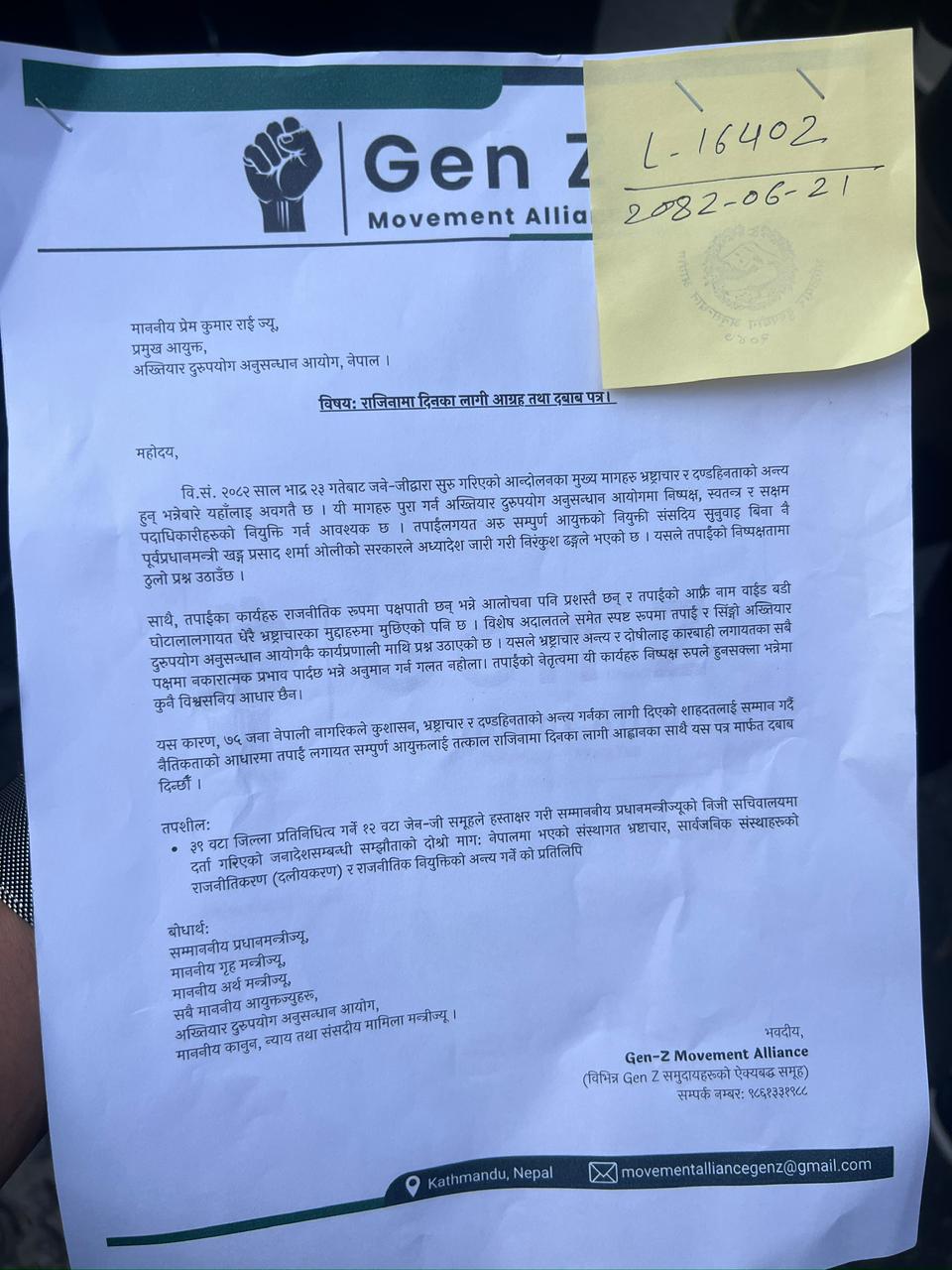 यसकारण ७५ जना नेपाली नागरिकले कुशासन, भ्रष्ट्राचार र दण्डहीनताको अन्त्य गर्नका लागि दिएको शहादतलाई सम्मान गर्दै नैतिकताको आधारमा तपाईंलगायत सम्पूर्ण आयुक्तलाई तत्काल राजीनामा दिनका लागि आह्वानका साथै यस पत्रमार्फत दबाब दिन्छौँ ।’