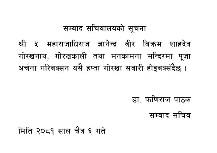 शाहका सम्बाद सचिव डा.फणीराज पाठकले बुधबार सूचना जारी गर्दै यसैसाता पूर्वराजा शाह गोरखनाथ, गोरखकाली तथा मनकामना मन्दिरमा पूजा अर्चना गर्न जान लागेको जानकारी गराएका छन ।