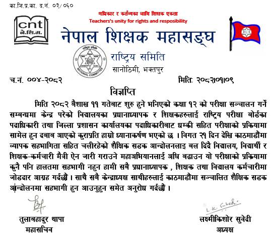 बिगत २१ दिन देखी आन्दोलनमा उत्रिएको शिक्षकहरूले परिक्षामा सामेल नहुने लिखित रूपमा जानकारी गराएको केही घन्टामा नै परिक्षा बोर्ड आफ्नो निर्णयवाट पछि हटेको हो ।