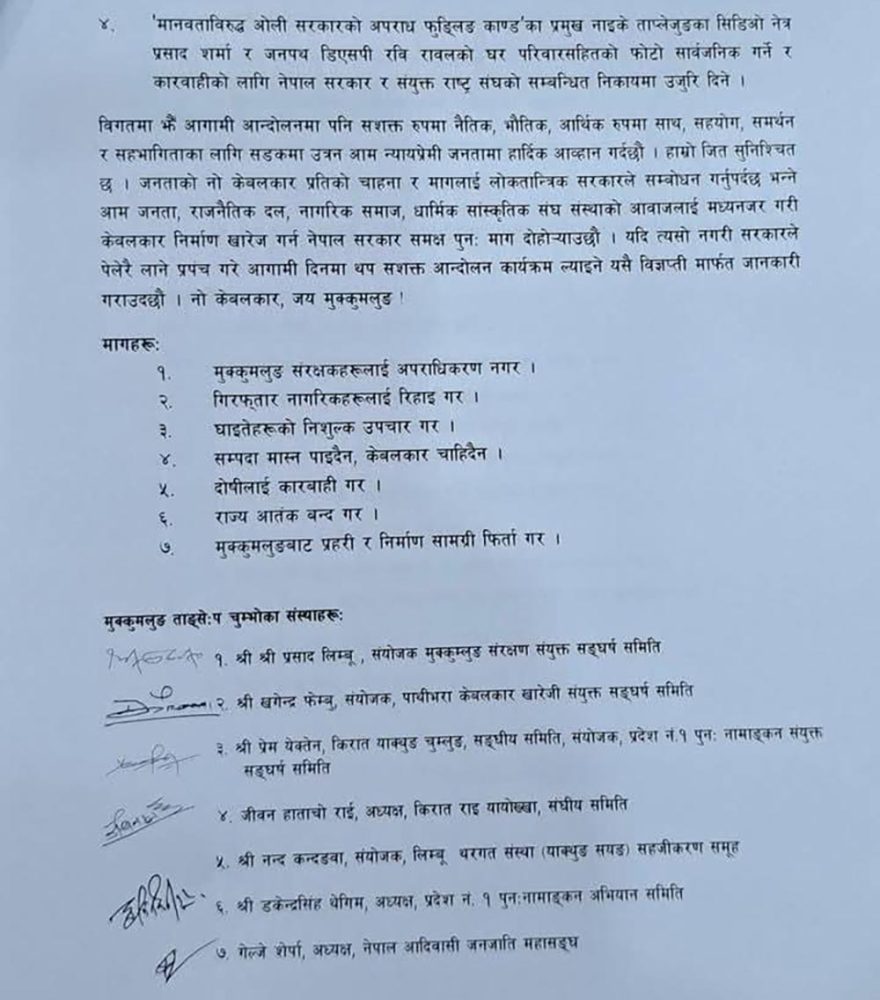 फागुन १८ गते ग्लोबल जुम बैठक गर्ने र त्यसको तीन दिनपछि काठमाडौंमा बृहत् जनप्रदर्शन र विरोधसभा गर्ने उल्लेख छ । साथै उनीहरुले ताप्लेजुङका प्रमुख जिल्ला अधिकारी नेत्रप्रसाद शर्मा र प्रहरी नायव उपरीक्षक रवि रावलका परिवारसहितको फोटो सार्वजनिक गर्ने र कारबाहीका लागि नेपाल सरकार र संयुक्त राष्ट्रसंघको सम्बन्धित निकायमा उजुरी दिने कार्यक्रम घोषणा गरेका छन् ।