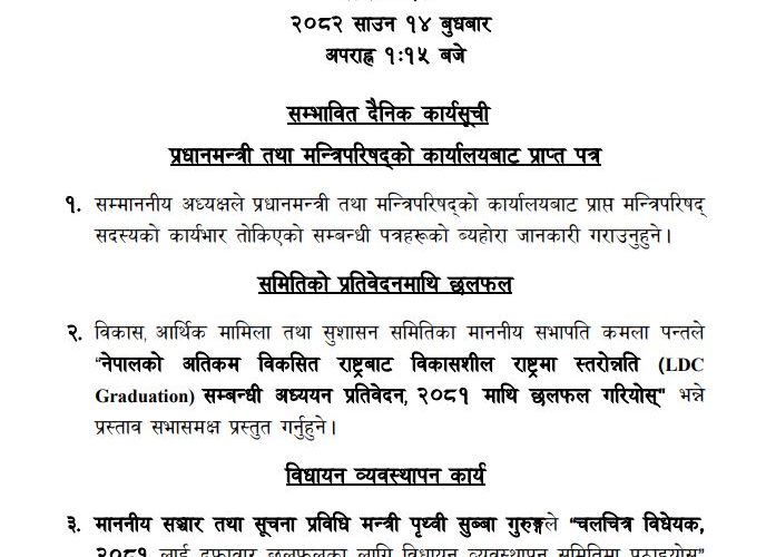 सञ्चार तथा सुचना प्रबिधि मन्त्री पृथ्वी सुब्बा गुरूङले ‘चलचित्र बिधेयक, २०८१ लाई दफावार छलफलका लागि बिधायन ब्यवस्थापन समितिमा पठाइयोस भन्ने प्रस्ताव सभासमक्ष प्रस्तुत गर्ने सम्भावित कार्यसुचीमा उल्लेख छ ।