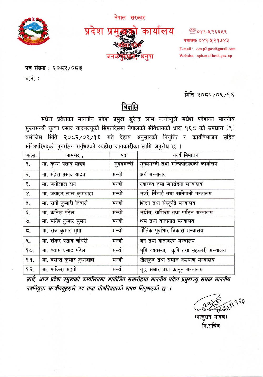 पौष १६, काठमाडौं ।  मधेश प्रदेशका मुख्यमन्त्री मुख्यमन्त्री कृष्णप्रसाद यादवले मन्त्रिपरिषद्लाई पूर्णता दिएका छन् । बुधबार तेस्रो पटक मन्त्रिपरिषद् विस्तार गर्दै मुख्यमन्त्री यादवले १२ सदस्यीय मन्त्रिमण्डल बनाएका हुन् ।