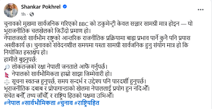 पोखरेलले लेखेका छन्, ‘चुनावको मुखमा सार्वजनिक गरिएको बिबिसीको डकुमेन्ट्री केवल सञ्चार सामग्री मात्र होइन, यो भूराजनीतिक चलखेलको जिउँदो प्रमाण हो ।’ पोखरेलले लोकतन्त्रको रक्षा नेपाली जनताले आफैँले गर्नुपर्ने भन्दै नेपालको सार्वभौमिकता हाम्रो साझा जिम्मेवारी रहेको बताए ।
