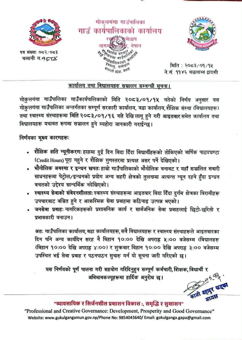 सूचना अनुसार गाउँपालिका तथा वडा कार्यालयहरू बिहान १० बजेदेखि अपराह्न ५ बजेसम्म, विद्यालयहरू बिहान १० बजेदेखि अपराह्न ४ बजेसम्म र शुक्रबार बिहान १० बजेदेखि अपराह्न ३ बजेसम्म सञ्चालन हुनेछन् । गाउँपालिका अध्यक्ष काजी बहादुर खड्काले सबै कर्मचारी, शिक्षक, विद्यार्थी तथा अभिभावकलाई उक्त निर्णय कार्यान्वयनमा सहयोग गर्न आग्रह गरेका छन् ।
